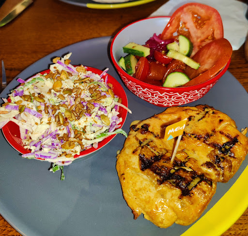 Doubt this location represents the general standard, if so I can't see how they stay open. Tried it with my girlfriend after hearing about the chain numerous times. We shared the roasted pepper and feta starter and the ½chicken with chips and garlic bread. After discovering that it was indeed our plate that was waiting at the counter for quite some time while three waiters was just chatting in the bar, it made sense why the garlic bread was hard to chew and the chicken too dry though marinated in a lot of sauce. The periperi/herb hot sauce was just bad and we got given both our starter and main course before having to ask for our drinks. Probably not trying...