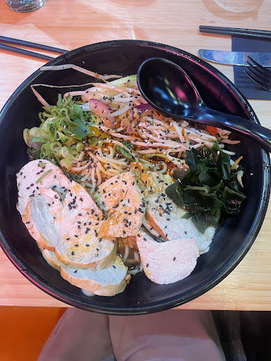 The chicken was so dry I couldn’t eat it. I pushed it to the side after one bite was too much. I thought the broth would at least be good (I make my own in the house and it’s not difficult) but it was bland with no taste just heat and usually I like spice but this was just catching the back of my throat and it was really greasy! Ramen is meant to be healthy ish but by frying pak choi etc before putting it in the broth I suspect is why it was swimming in grease. When the waitress collected the bowl she should have noticed the chicken wasn’t touched. Not great.