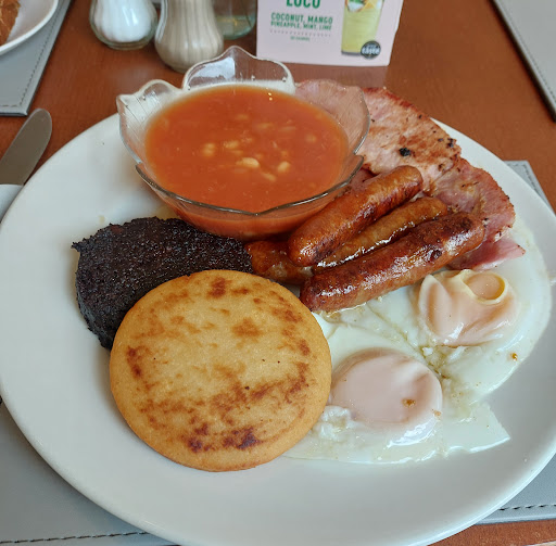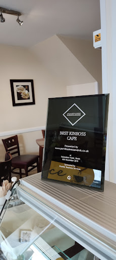 Popped in here after a recommendation from a local we met whilst having a walk and will definitely be back next time we're in Kinross! We made the mistake of ordering when we were absolutely starving; starters, mains, sides of chips.. this was not needed, hahaa. The portion sizes are amazing, and at such good value for money! We were too full to sample any of the cakes, but these also looked really nice. The cafe is dog friendly which is a huge bonus, we sat upstairs in the corner whilst the dog snoozed under us, patiently awaiting a sausage.. the only downside of this seat is that it stares directly into the toilet and people kept leaving the door open after they used it! This can't be helped, overall the cafe had a nice cosy atmosphere and seems...