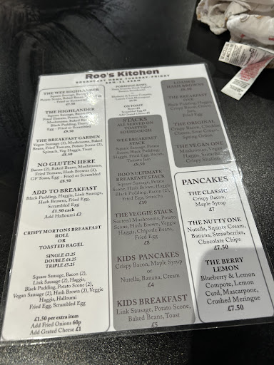 First time in Roo's Kitchen. Ordered lunch and coffee. The coffee was served way too hot which unfortunately burnt the coffee grounds and affected the taste. Pancakes and bacon with maple syrup was expensive for the size of the portion. The menu stated that pancakes were "fluffy" but they were rather doughy and undercooked. I'm sure if I had said they would have replaced but my wife was on limited time and I didn't want to cause a bother as it was busy with only two staff members. The bacon was lovely and crisp though. Perhaps a bigger portion of maple syrup would be nice and another slice of bacon as I was still hungry. We did buy a cream biscuit cake item to take away which was very very bland and had very little flavour. That was very expensive at £3.50. My wife's haggis and cheese toastie looked flawless though and she thoroughly enjoyed it.