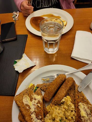 We arrived and were greeted by a 12-14 year old carrying a large tray of crockery who nudged us towards a table in the corner to which we sat and waited 12 minutes for menus to be put on the table after that we ordered 8 minutes later and asked for Scrambled eggs on toast, pancakes with syrup and cream and 2 waters for the table we then waited 15 minutes and all our order arrived at once with a sad single pancake for 5.50 with minimal cream and syrup we tried to get a hold of a server to ask if there was anymore to arrive but the kids were busy with dealing with other tables so we ate our meal and while eating it got quite busy with the older lady coming to save the day getting orders in as the kid got frazzled with the rush after that we got up to pay and the kid cleared our table while we were getting our coats on after that we paid and mentioned the sad pancake with the slow service and she apologised I mentioned that I would probably reccomend some light training for the young servers and rather than having matching uniforms and she replayed frustratingly thank you overall the young servers were doing the best they could with what they had quite...
