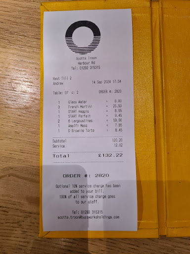 Read moreWe visited Scotts Troon for what turned out to be our last dinner together in a restaurant, as my wife tragically lost her battle with cancer a month later. I wanted this to be a memorable and romantic evening, but unfortunately, the experience was marred by rude and dismissive service. I would've been my usual self by standing up and leaving, but my wife wasn't feeling her best, and insisted on enjoying a night out together even still. So I chose not to make a scene.