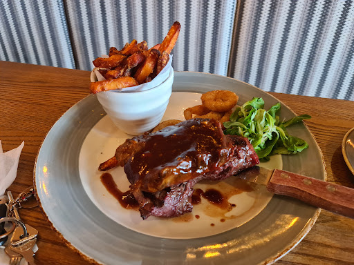 The staff were lovely and friendly, so attentive and they honestly seemed like they loved their jobs. They served us drinks and our starter in the soft play area then helped us move through to our proper table when the time came, we had a absolutely lovely camembert wheel with toast and chutney to share as well as the sweet potato, chickenpea and red pepper koftas to share and both were lovely. The mains were lovely as well, Gran had a chargrilled duck salad which she said was very nice, my brother had the steak and ribs which he thoroughly enjoyed, and the ribs were really good as well, nice and tender, sizeable amounts of meat on there! I had the steak sandwich which was lovely, the steak was melt in the mouth, no grizzle, and tasted really nice.