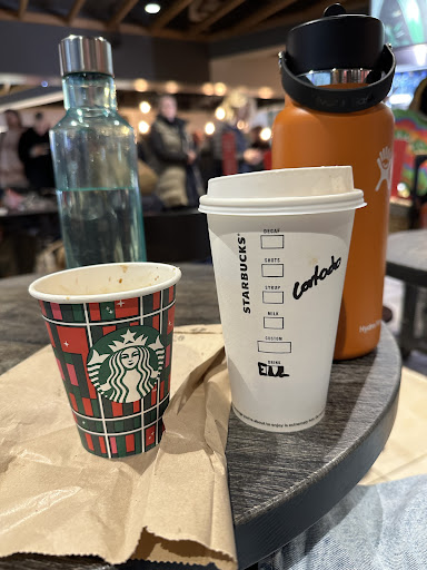 There is nothing wrong with the staff in here. They’re all polite enough, not overly keen to make the start of your outbound journey pleasant but not rude either. The issue is the amount of time it takes them to serve you. There’s five of them plus two on the floor bussing and cleaning up. Seven staff essentially for one queue. So, how they appear to work is task driven. So, one does the drinks, one services, one heats the food etc. A good way to work by and large - McDonald’s take note. Except, the service itself just isn’t there. I was third in a queue of ten. Yes, I’m sad - I counted backwards but only because I wanted to highlight that there is a service issue in this place. Being in the service industry myself I hate to leave bad reviews, but equally I hate bad service. Especially when it is systematic and frequent, as it has been here each time. It took them twelve minutes to take my order of a breakfast roll and a bottle of water. There is no impetus, it seems to ask a second person to jump on which I would always ask my staff to do anywhere I’ve managed. There are other tasks that can wait until things slow down. That’s perhaps on management because they always seem to be on staff to get things done. How about cutting your staff some slack so that they can give a customer focused experience. Nothing worse than going on your holiday’s and the people serving you look like they just want to curl up in their beds and never meet human existence again. As I write this, I see that almost twenty minutes later, the person at the back of the queue when I was third is only just being served. That means that person has been waiting almost half an hour in a queue of ten to order a coffee in a place that would have a cheek to imply they are short staffed. As I said, SEVEN staff in total with the Starbucks uniform on. I’m aware the place is in an airport and there is an element of people having lots of time to kill. Not always the case. There are lots of elements that can put people under pressure -= long security lines, other shopping, running late, gates in the distance. As i say at the beginning, nice enough staff - could use a smile or two now and then, no issue with any verbal exchange and have never heard them being rude any time I’ve travelled but I think that amount of time to order a water and a breakfast roll in a highly staffed store is just very...