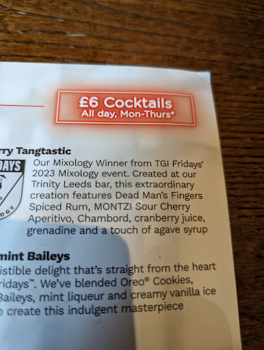Read moreWe took the kids for what we hoped was going to be a nice meal. We wanted to go somewhere a bit different than just the usual holiday cafes we have been going to. As we looked at the online information and saw a great offer of kids eat free with an adult meal so we chose TGIs We Sat at the table and the waiter came over fairly quickly and took our order. We weren't asked if we have visited before as we noticed other diners were being asked this. There was no drink menu on the table. No deals were ran through or anything like that. I ordered chicken fajitas and asked for any and all sauces to be put on the side. Food came after quite a while considering when we visited it was not busy. 4 pm today - food was also staggered mostly it was luke warm at best. One portion of chips was hot and this just highlighted how cold the rest of the food was. Sizzling fajitas were covered in sour cream and not sizzling in the slightest. Dried out tiny pot of cheese. When I said I had asked for no sauces on the fajitas they did take them back and fix it. But it took a while, the rest of my family were well Into their meals by this point. John our original waiter disappeared and never came back to see if we had everything. A while after the kids got their meals and me still minus mine I asked a member of staff of wr could have ketchup, I was told I should find some down near the service point near the stairs and to go and find it. A female waitress gave us a passing everything ok.. no I am waiting for my meal the kids would like ketchup and BBQ sauce as they were halfway through their meals and no one had asked us. The fajitas were the strangest I've ever had. Nice chargrilled chicken but on top of some soggy veg with no seasoning at all so essentially chicken with unflavoured soggy vegetables. When the bill came we noticed that the kids meals weren't free. After checking the small print we seen that this was of you have a loyalty scheme. I do feel that after having a long career in hospitality that it's not really down to the customers to know your menu and deals better than the server. For me it was always about advising the customer on the best deal for them. I don't know if that would have worked I e could we have signed up today and then been offered the free kids meals. We had intended on having a couple of drinks and deserts but after the entirely underwhelming service and food issues we didn't bother and didn't fancy causing any further issues with querying the bill. There was an apology over the delay but nothing by way of any offer of a juice or something like that. For the price of the food I would expect actual basics of food service to be a given. Very...
