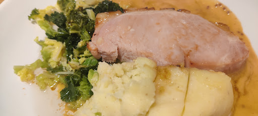 I had the loin of bacon in a mustard sauce with mash and kale. The loin was good, as was the sauce. I think the mash could have been more creamy and buttery, it was a little solid. My partner had the lamb in mint and red currant gravy with sauteed new potatoes. The lamb was soft and flavourful. It was very good but not a show stopper for the money.