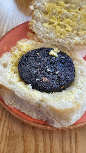 The massive scone did taste good 👍 & the 2 portions of butter were ample & they didn't skimp on the lovely thick tasting jam. So if you pop in remember to ask for it to be warmed up & maybe those bits of fruit will soften up like the cushions u can sit on BUT don't sit in the damp ones at the window 🪟 There the condensation ones 🤭