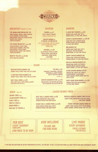 Read moreFood: average meal was about 13 quid a head. The main dishes said they came with chips. What came was over cooked chips numbering about 8. The meat we had, the burger and then steak pie were overcooked and then not very warm- I am unsure if the burger was cooked from fresh. The onion rings were definitely frozen and then cooked. The fish batter was way over cooked and was not nice. As for the chilli bowlâŚ.it was horrific. A splattering of shop bough nachos, a small amount of chilli and 5 mini bowls of toppings. Again it was cold.