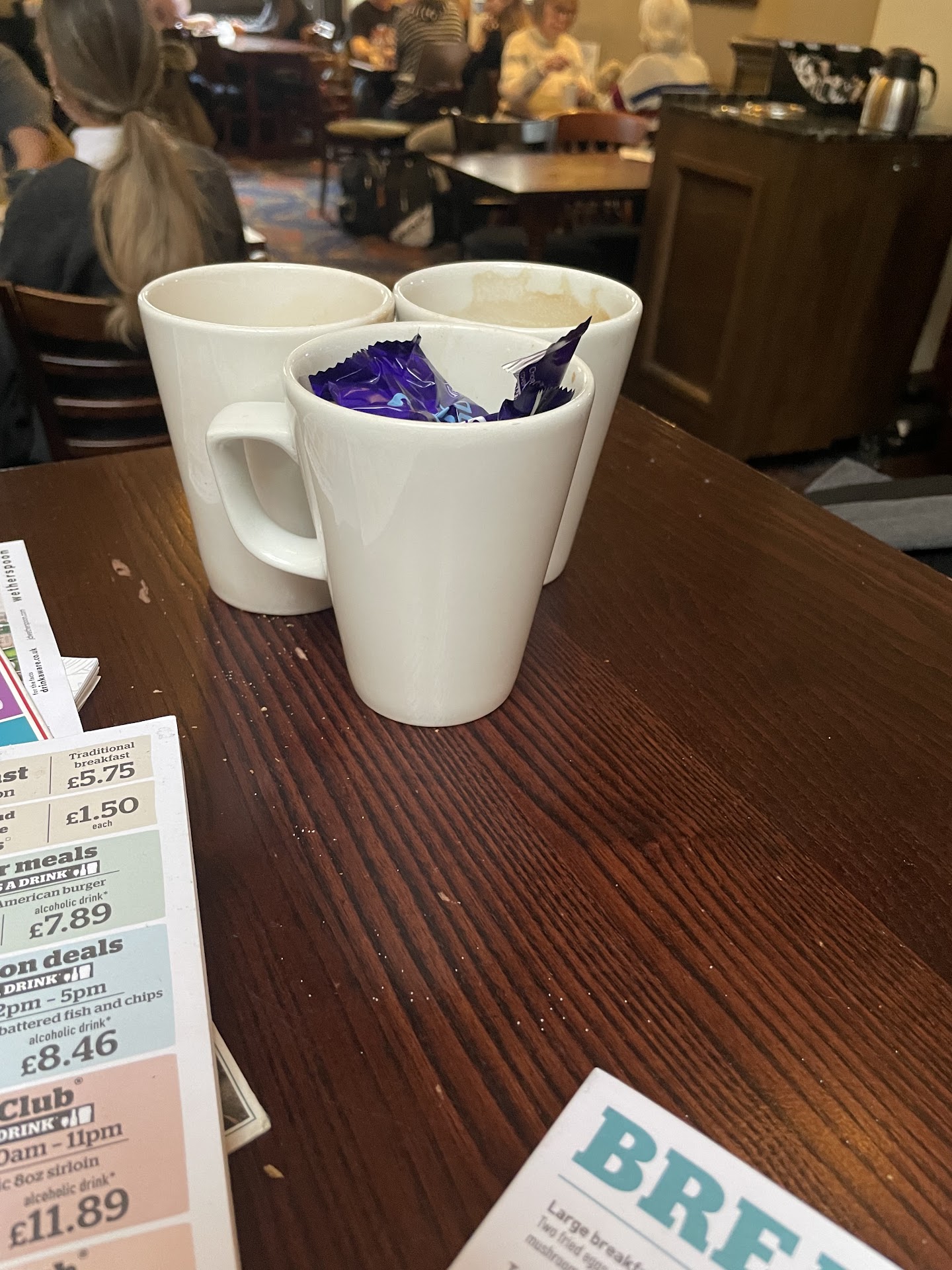 Read moreCame for breakfast on 17/05/24 with my husband before a day trip. As usual there was a lot of messy tables but we found at least one tidy table. I ordered a traditional breakfast and one small vegetarian breakfast (which does not include toast), one Pepsi max, one tea and an extra toast. Wetherspoons pubs used to be pretty reasonable price wise but not any more! The cost of living has certainly pushed up the prices, this lot came to £16.83p.. I went to the self serve hot drink station which was also pretty messy to get my tea and returned to table 51 to await my order and I managed to finish the tea before it arrived as it was only lukewarm. The orders arrived and were underwhelming to say the least. The traditional breakfast included fried egg, hash brown, link sausage, bacon, beans and toast. It didn't look appetising at all and it was again tepid. The small vegetarian breakfast included hash brown, fried egg. Vegetarian link sausage and beans. It came with an unexpected extra, a slice of bacon which as I wasn't in the mood to argue about I passed to my husband. The warmest item on my plate was the vegetarian sausage which was actually pretty good actually. The extra toast tasted like melba toast, cold and dry and crumbly, not like real bread at...