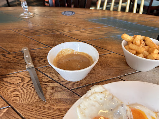 Came with my partner for dinner and we walked inside and looked for an empty table that was cleared of plates etc however there weren't any so we took a table and placed all the dirty stuff to the end. A sign on the table said to order using the app so we did. Soon after placing the order, a member of staff came to our table to inform us that they only had 1 steak left so one of us would have to change our order. I said I was happy to change mine and the guy said I would have to go with him to the bar to sort it out on the computer. I followed him to the bar and he said he would need to go get his manager. The manager appeared and I recognised this lady from a previous visit we had. She was not at all happy and didn't even acknowledge me standing there or make any eye contact. The guy then told her the issue and she swore and said this was going to take ages to fix. Without looking at me, she told me to go back to my seat as it would take a while. Eventually our food arrived and we asked for cutlery. The server pointed to the stuff at the end of the table which we had stacked and said there's cutlery there. We told him that was all the stuff from the previous diners. He went and got us clean cutlery but left the dirty stuff on the table. I asked where our drinks were and he said that we'd have to go get them ourselves as they were short staffed. My partner went to the bar and the barmaid was standing waiting for a customer. He asked if our drinks were coming and she just pointed to the drinks orders laid out and asked which one it was. So she made the order and my partner brought it back. We finished our meal and had already gave a tip due to paying via the app where it asks for a tip upfront. The manager never appeared with a resolution to the mix up to the order so no idea if I'll be getting a refund for the difference or not. Given the fact on each occasion I've been in when this manager has been on and we have had a bad experience we...