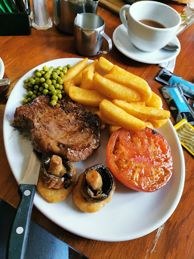 The steak, OMG, it was such a huge portion! Am sooo happy! The big chuncks of chips, the big cut if steak, the nice peas, mushrooms stick to the onion rings and the magical fresh and big super juicy tomatoes for only ยฃ12.90! Loved it soo much! I was such a satisfied customer! The burger was also looked nice and it was also delish for only ยฃ8.80! Good for tummy and money! Very...