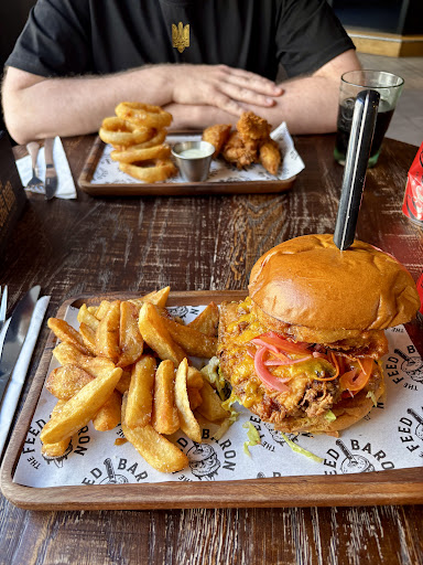 The feed baron is now in residence for the forseeable future at the Westhill Golf Club, providing the usual amazing burgers and fries from the van from ashdale hall, as well as pub grub such as fish n chips, sandwiches etc. We arrived on a Sunday for lunch. Had the tempura king prawns and the pork croquettes (forgot to get a picture of this). Both starters came out very hot, and it was clear it was all handmade. Prawns were big and juicy in the crispy batter, pork was really nice in the croquettes. We got a couple burgers for mains, the Hit honey chicken burger and the king of the hill burger. Chicken burger had 2 big fillets of tender chicken covered in very crispy batter, also had pickled red cabbage and the hot honey sauce, thick and spicy. The king of the hill burger had 2 smashed patties, plenty of cheese, and onion ring and some bacon. This was the star of the show, unreal! Would recommend getting this. Finished it off sharing a big piece of sticky toffee pudding, which was very warm, had very thick sauce and a big dollop of ice cream. Left feeling very full and very satisfied! Book in to this place...