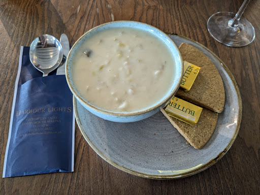 Read moreSuch a shame. Whilst the food and atmosphere were both excellent, the Harbour Lights was let down by the service. To clarify, two out of the three ladies who served us were lovely and helpful, however the third greeted us at the door in a curt fashion whilst checking her watch and led us to our table without a word. Having finished the meal we requested a couple more drinks from the same lady who once again checked her watch and left without comment. We subsequently noticed that the establishment was in the process of closing for the afternoon and apologised to another waitress for being a nuisance. She answered by saying that it was absolutely no problem at all, which we felt was the correct way to respond. The rude waitress should not be working at 'front of house' and should not be waiting at tables with such a poor attitude.. A simple 'sorry but we're about to close' would have been a more appropriate and acceptable reply to our request. Checking her watch and leading us silently to our table most certainly was not. It's a pity we were left with a feeling that we were merely being tolerated, especially when the atmosphere, location, food and approach by MOST of the staff was so nice. Sadly the whole experience was a disappointment due to one individuals attitude. We only went for lunch and would have returned for dinner had we been greeted and served in a more pleasant manner. I doubt we'll be back. Visit at around 3pm on...