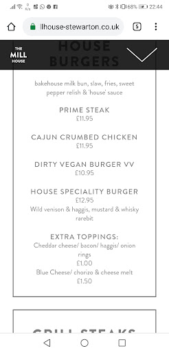 Read moreWe are generally fans of buzzworks, however although the interior is very stylish and comfortable and our waiter very professional ( clearly trained in some fine dining establishments) the menu was as we expected, unfortunately the execution and food translation sadly lacked. The butcher's choice shareboard was plentiful, tasty and nicely presented. I chose the house speciality burger, the menu giving the impression that it would be a venison burger topped with haggis, a mustard and whisky sauce and cheese ( rarebit ) sadly the reality is venison and haggis mashed together in a burger, totally losing the haggis taste, a fifty pence size blob of something red on the middle of the base of the bun and a blob of the same size of what I can only assume was the mix of mustard, whisky and cheese on the lid of the bun. Neither blobs being significant enough to taste or have any impact on the dryness of the bun, the burger was topped with a slice of tomato and the tiniest saddest looking lettuce leaf ever. Although it wasn't bad it certainly wasn't great and the menu description and food reality were miles apart. My husband had the steak pie, the meat was tender and tasty but it swam in a meat soup which could have done with being thickened slightly. Our side of onion rings were way too greasy. Hubby said his caramel cheesecake was lovely and our lattes were very good. We only had one drink each and our bill totalled £64.95. Had the food been of the standard that The Longhouse and Elliots serve we'd have been delighted with that, but it has to be said that The Millhouse is definitely the poor cousin of the three. Unfortunately we won't go back we'll stick to the buzzworks quality of elsewhere. It should be said that the meal wasn't bad it was just ok and below average of comparable eating places...