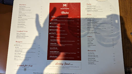 Read moreThe Montford is really good, the food is delicious, the staff are friendly and it's not expensive. My partner and I split a sharing platter for our starter. Now, we don't normally do the three course meal thing, but this was so worth the food induced haze on the drive home. The nachos were great, the garlic bread lather with lots of garlic butter (but not to the point it was sodden) the crusts crispy and the bread lovely and soft. There are onion rings hiding under there too, the batter nice and crispy.m and the mozzarella sticks were piping hot with a good cheese pull on them. For my main, I had jacked chicken. Which is chicken breast topped with cheese and a delicious barbecue sauce, I added bacon to mine. And opted for the delightfully fluffy-on-the-inside and crispy-on-the-outside hand-cut chips. For my dessert: a bannoffee sundae. I won't lie; by this point I was stuffed, so I mostly picked out pieces of banana. But what I tasted of the ice-cream was good too. My other half had the chocolate fudge cake with pouring cream. Which he said was nice- but not as good as the one his mum makes.