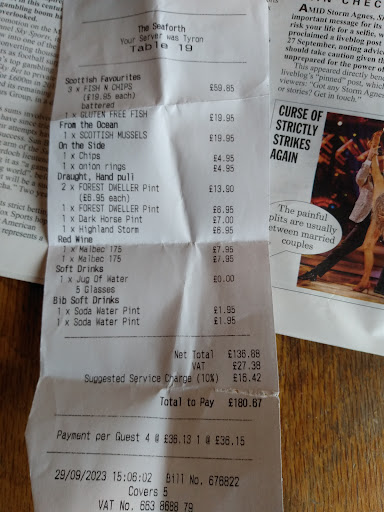 Lastly adding gratuity to your bill automatically is not acceptable. We live in Great Britain ,Scotland where minimum wage and living wage standards are good . A tip is for excellent or exceptional service and is at the bill payers discretion! Plus being at a dirty smelly table and feeling uncomfortable about not wanting mushy peas ,it was plain rude to automatically add a gratuity to a bill . Then made to feel uncomfortable about removing it . Cannot pay in cash which I prefer to do , no signs or indications that itās card only !