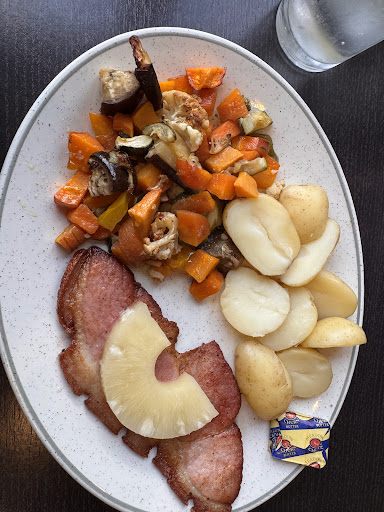 Met by an unsmiling staff member who gave just the choice of two tables near the door even though there were open tables near the window of which only one was occupied. Another couple came in a few minutes after we ordered and was also given a table near the door. By then all tables near the windows and outside were unoccupied the rest of our meal. The tables near the door were noisy as gas station patrons flowed in and out to use the restroom in the cafe. the hard slamming door added to the lack of ambiance.