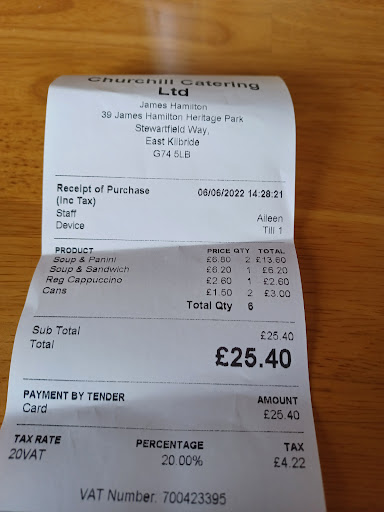Read moreGood location on Lochside at James Hamilton heritage park East Kilbride. Nice verandah style outdoor Terrace. Food is good, some items a tad expensive. A major annoyance was the fact we arrived at 12noon on the dot. We noticed on wall menu, cooked breakfast. When we asked for two we were refused at literally one minute past 12.cos they said breakfasts finished at 12.This was a true "Falling Down"Michael Douglas moment.Sausage,egg,Bacon And black Pudding cooked in same way as breakfast could still be purchased on morning rolls all day but couldnt be simply put on a plate with a slice of toast at 1 minute past 12 C'mon guys, if grills were off for the day that's fine but they wern't đ the roll with 2 slices of fried/grilled bacon was great Its a fine line of argument, i know but it was1 minute late, the time it took to read the wall menu. Hardly impressive ...