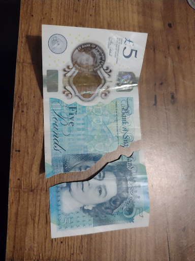Fair enough. Given my change, five pound note and the rest. The beer is slightly on the turn, bit flat (I won't name the brewer). After finishing my first I go to order another (likely draft) as the rugby's on only to find that the note has ripped in the time it's gone into my pocket. I inform the barmaid. She waits to inform the manager. Who is insistent that I wasn't given a damaged note as he checked them all this morning. I say that it was fine when handed over - but there's obviously something faulty with it for it to collapse in going to my pocket. I've been honest, but left to feel like a liar. Not what pubs are about. Dread to think who they'd blame if you took them up that there was something wrong with the...