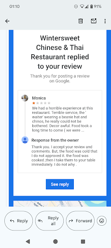 We had a horrible experience at this restaurant. Terrible service, the ' waiter' wearing a beanie hat and chinos, he really could not be bothered. Decor awful. Food took a long time to come ( we were the only customers at this point) there had been one other table. Food was cold, we said to waiter, he shrugged his shoulders and walked away. Terrible service, no atmosphere and food cold and gloopy sauce. Never again. The statement made by restaurant that the food wasn't cold is a nonsense. I'd never make a dishonest claim. I told the waiter at the time and as I stated he shrugged his shoulders and walked away. Unbelievable response!!! a complete nonsense!! I wrote the the manager but received a call from the guy who I ABSOLUTELY told the food was cold. He shrugged his shoulders and walked away. Taking the lemon chicken with him. BECAUSE there was NO response from the manager my husband spoke as he was paying the bill. The food took AGES to come. I walked out ahead of my husband as I was DISGUSTED. He was never prompted. I received a phone call yesterday from the author of the reply!! Rude nasty man who denied EVERYTHING. I hung up on him. I am certainly not being bullied for telling the absolute truth. What a farce. We are professional people with NO reason to lie. I notice your ORIGINAL reply which was " I accept your review...." Has been conveniently removed. Totally dishonest. My husband was NEVER aggressive and If that is not retracted I will take further action. COMPLETE AND UTTER RUBBISH , LIES AND COVER UP.oh and your original...