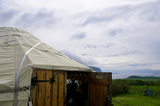 The yurt is located next to the Skyeskyns shop. From the outside you'll have a beautiful view over the bay and it's surroundings. Indoors the vibe is very friendly and nice. However, no views on the surroundings when you're indoors.