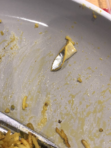 Read moreWas dissapointed after reading positive reviews and having such a bad experience. Ordered for delivery, which arrived late. On the menu it told us to put which naan we wanted in the comments, comments were clearly ignored as the naan wasn't sent with the order. Onion bhajis were overcooked and dry. I had the vegi korma and towards the end of my meal I noticed something hard and unchewable in a mouthful, turns out it was some packaging, seems to be cardboard with foil, maybe the edge of a milk carton? I Attached a picture, your guess is as...