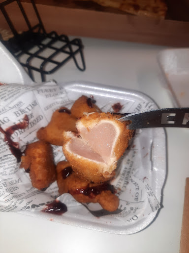 Read morei used to like this takeaway but after tonight ill never eat there again we ordered burgers an some hoisin chicken nuggets and other bits from there collected it got home started to eat my partner took a chicken nugget bit into it and it was completely raw this made her feel physically sick and was sick we binned everything made sure the kids didnt eat anything i took the box of nuggets back as i wanted a refund after a full blown arguement with the man (who had very poor customer service) in the shop i had to ask for the owner who was nextdoor in there shop pitfire after telling him about it they were only willing to only offer a refund for the chicken i was not happy with this and continued to ask for a full refund he said he did not believe me that my partner had been sick so was making out i was lying in the end i got the refund but i will never be eating...
