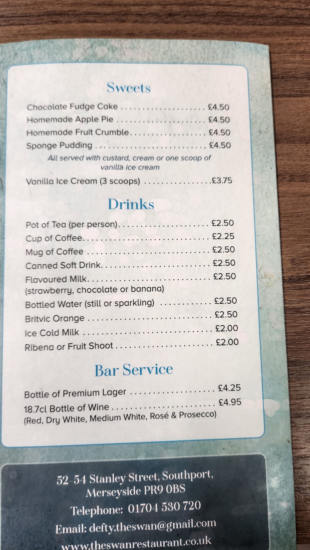 Love this place and so did my great grandmother and her sister from Bacup. Everytime her sister would visit for a few weeks they would go to southport for a day out each week and would go to the Swan before they went home. Was a bit disappointed in it today. Chips were good but large cod dinner was not really large and one small slice of bread and butter (come on it looked pathetic on a plate) should be at least 2 slices. I decided to have a pudding of apple pie and custard. The apple pie pastry was all soggy and not tasty at all. It had obviously been microwaved and just tasted awful. The custard is usually a favourite but this was cheap nssty stuff. Won't be going back in a hurry even though I love this place usually and would usually have the home made steak pie. I was also a bit concerned as it is a small restaurant and although customers are not required to wear a mask as they are eating I do the the staff need to wear a mask. They had covid measures in place with a one way system etc and a hand gel station but they were not telling customers to use it. The staff did ask me to fill out a small contact form with name telephone email and date but then didn't ask a table of 2 people or a table of 7 women to complete them. I was also a bit worried as although they "STERILISED" the table they didn't sterise the ketchup vinegar salt tartar sauce etc which they were switching between tables and guests. So again without staff wearing masks or guests not wearing masks because we're eating is it really safe to handle ketchup after many...