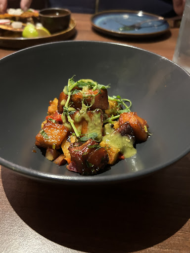 The pork belly and charred pineapple was fantastic and the boldest flavor of any of the dishes. Also delicious was the brisket taquitos (although Iâd used corn tortillas and I donât think the consommĂ© works very well).