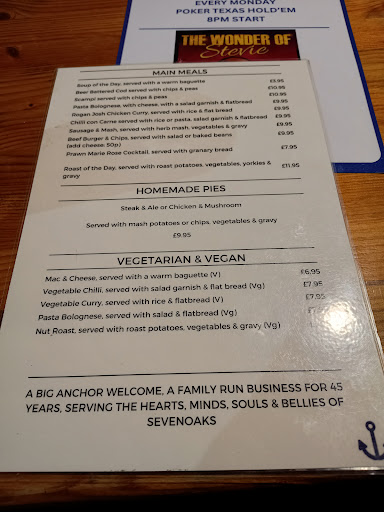 Best pub in Sevenoaks, simple as that. As well as a top-drawer selection of ales at the lowest prices around The Anchor has the full range of amenities you'd expect 'the local' to have but so few still do; fresh food every day, live music at least twice a week, regular darts matches, television in a corner discreetly showing sport, even a meat raffle, as well as occasional specials, for example an authentic Greek meal van visiting once a month. None of this would work without personality and under the leadership of Barry, the biggest hearted landlord in the business, the staffs natural charm make this the friendliest and most welcoming pub you could hope to visit. I've seen some places with 'Enter A Stranger, Leave As A Friend' on the door; The Anchor doesn't need a sign to say it, it's the reality of the place. If you don't leave here with a smile on your face walk across the road to the Town Medical Centre and tell them your soul's fallen...