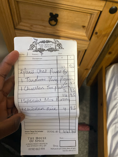 Read moreHouse of Spice Shanklin, I was not impressed at all. Place is little dingy probably last updated 20 years ago. Guy I think the owner was in shorts and T shirt. Does not give a good impression, tables could do with a good clean. Floor was a little sticky Service was little slow even though the place was not full. We had 4 Papdoms, did not ask for condiments but we were served with Mango Chutney, chopped onions and yougart with some mint. Mains: Chicken Jailfrezi, Brinjal vegetable, 3 plain Nan, butter Chicken and plain boiled rice. To Drink: 2 -J2O and one Fenta. No Sweets. Hand written bill that has been overwritten on several places to £ 73.00 I was trying to work in my head as it seems excessive but the chap stood with a machine asking us to pay. We payed but they will not allow us to take hand written bill. It does not require a calculator to add bill. They overcharged by over £10. Back in my hotel I mentioned that to the hotel owner and one of the guests. They had similar experience. Q- why curry restaurants write bill by hand and do not let customer have that copy? Q- Why suddenly they started charging for condiments? If they are going to charge they should make it clear to customer. I would have had only one dish-Mango Chutney. Others were not worth it. Food was average to reasonable 6/10. But the above meant we would avoid going there again. And drive few miles to another place. Nans were good. Jailfrezi reasonable. Brinjal below average, Butter chicken was what we wanted for kids....