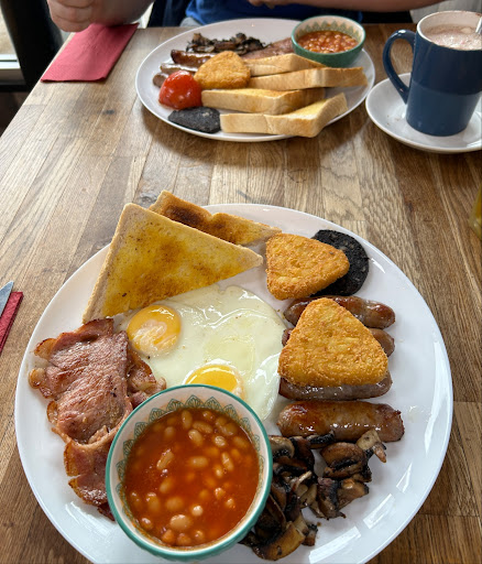 Unfortunately a steady 2 only review from us on our visit today the positive thing from today was the coffee and tea reasonable price and delicious coffee, On arrival told sit where you want so took a window seat for the 2 of us The breakfast menu looked intresting so I chose the Eggs Benedict and The other person a full English Let's start first with the full English 2 bacon ,sausage, eggs , hash brown, black pudding, Tom's, beans, toast As you'll see from the photo a huge plate arrived (you'll see the issue here) huge plate with food spread out spread out so much they cut the sausage length wise in half to try to spread the food around the plate to make it look fuller, The issue with the plates springs in to mind who designed the place when thinking the plates would fit onto the table for 2 🤪 So now the Eggs Benedict or should I call this the Eggs none Benedict if you can fried eggs and bacon on a none toasted muffin covered in alot of hollandaise sauce served with doritos and a salad that was so wet it had obviously been sat in a tub with water in and just placed straight onto the plate, I've never had such a strange Eggs Benedict ever, how on earth they can call it that well it's beyond me, So I'll leave it for you to decide trying to fit the plates onto the table, Fitting things weirdly onto a plate to either make the breakfast look bigger than it is Or a need for those extra large plates 🤣 The Eggs none Benedict ought to be renamed for sure and maybe advise the chef that it's not safe to leave the side salad in pots of water let alone then putting them undrained onto the plate So all in all a thumbs down from us But we shall be back to see if anything improves or is learnt from...