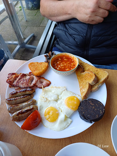 Unfortunately a steady 2 only review from us on our visit today the positive thing from today was the coffee and tea reasonable price and delicious coffee, On arrival told sit where you want so took a window seat for the 2 of us The breakfast menu looked intresting so I chose the Eggs Benedict and The other person a full English Let's start first with the full English 2 bacon ,sausage, eggs , hash brown, black pudding, Tom's, beans, toast As you'll see from the photo a huge plate arrived (you'll see the issue here) huge plate with food spread out spread out so much they cut the sausage length wise in half to try to spread the food around the plate to make it look fuller, The issue with the plates springs in to mind who designed the place when thinking the plates would fit onto the table for 2 🤪 So now the Eggs Benedict or should I call this the Eggs none Benedict if you can fried eggs and bacon on a none toasted muffin covered in alot of hollandaise sauce served with doritos and a salad that was so wet it had obviously been sat in a tub with water in and just placed straight onto the plate, I've never had such a strange Eggs Benedict ever, how on earth they can call it that well it's beyond me, So I'll leave it for you to decide trying to fit the plates onto the table, Fitting things weirdly onto a plate to either make the breakfast look bigger than it is Or a need for those extra large plates 🤣 The Eggs none Benedict ought to be renamed for sure and maybe advise the chef that it's not safe to leave the side salad in pots of water let alone then putting them undrained onto the plate So all in all a thumbs down from us But we shall be back to see if anything improves or is learnt from...