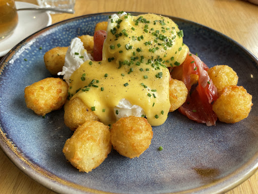 I ordered a pot of Earl Grey tea, which was delicious. The tea was perfectly steeped and had a strong, flavorful aroma. I ordered a Royale something - I forget. I upgraded to tatertots to replace the toast. The poached eggs were delicious, hollandaise delisious, the salmon was yummy.