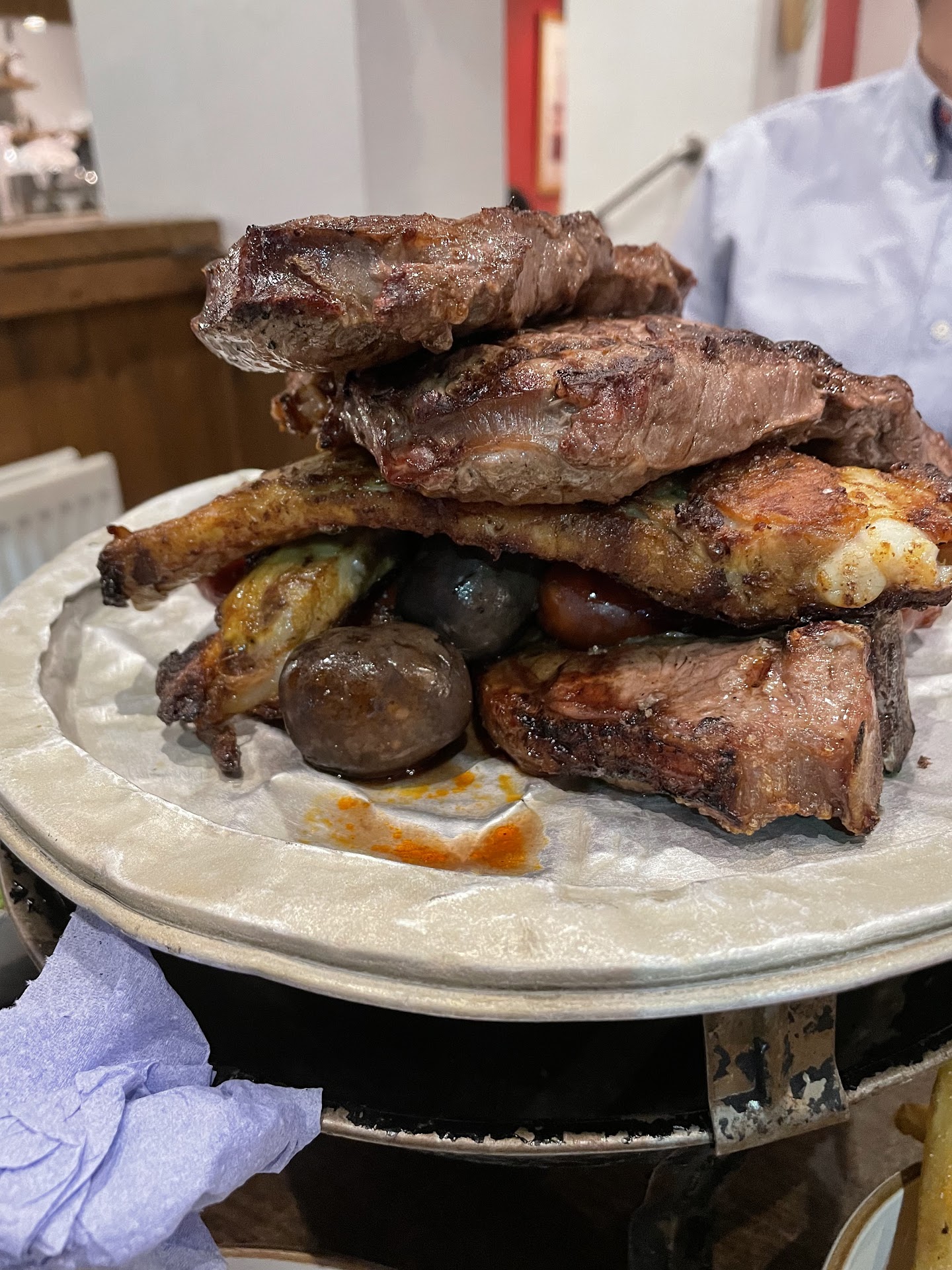 We decided to go for the Parrillada – Minimum of 2 people £21.50pp; Includes 2 x 8oz Sirloin steaks (cooked to preference – ours is medium rare), chorizo, morcilla (mini sweet Spanish black pudding), pork ribs and chips. We also got a side of Greek Salad £3.50 and Baked Tomatoes £3.00. Our aim was to take any leftovers home… but there wasn’t any.
