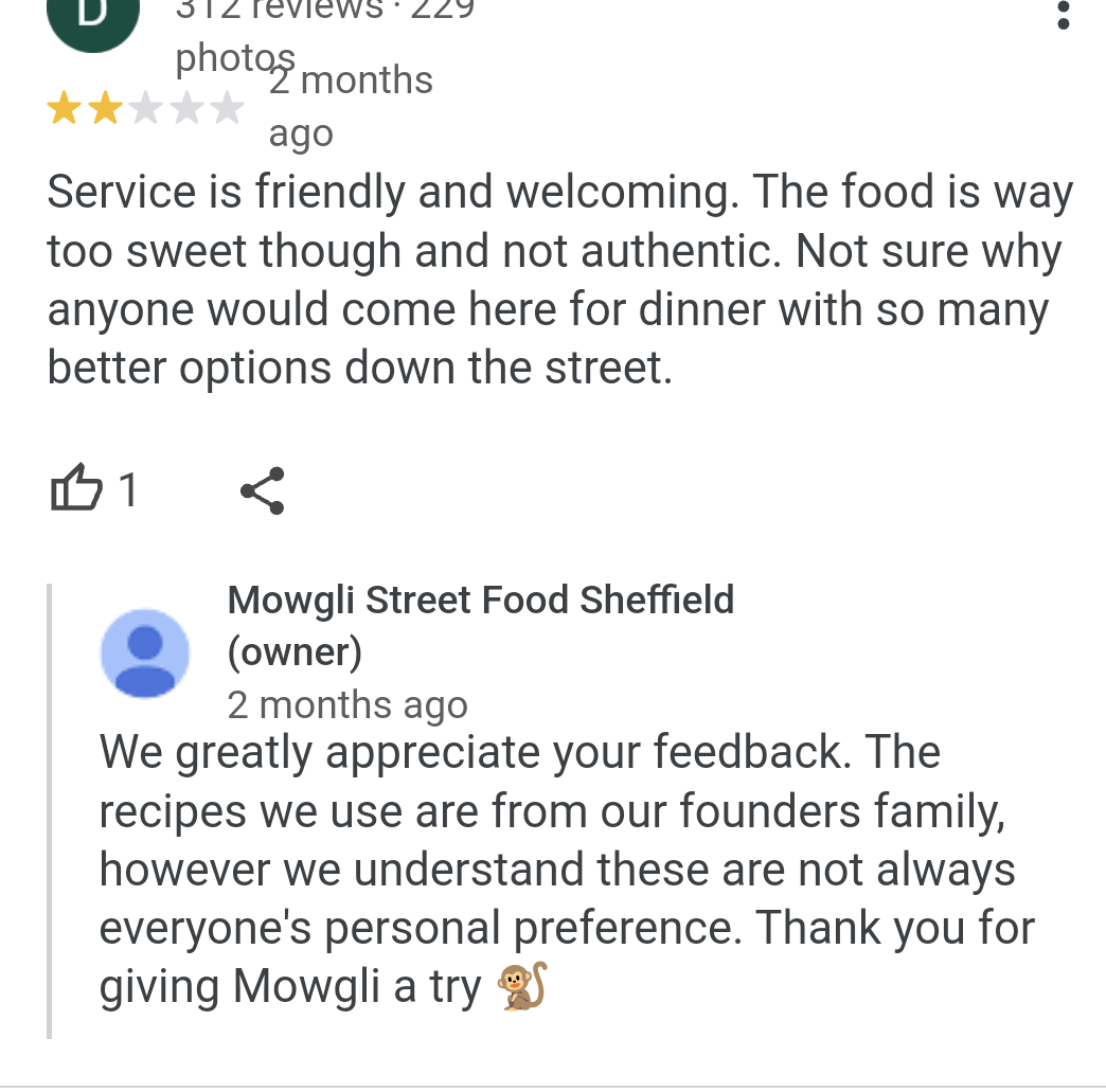 Read moreI made a complaint about the Sheffield branch of Mowgli, received an apology but no sort of compensation or remedy to our experience.