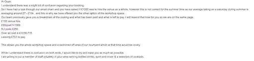 To his credit he manager we spoke to in person in March (I'm very sorry we didn't make a note of your name) did offer to provide the originally agreed food menu, he was also very apologetic and promised they would try to make this up to us by offering multiple things for free and even trying to move the booking in the other half of the venue if they could, but the email we received following up after (which very clearly wasn't from the manager we had just spoken to) was very abrupt and didn't take any ownership for the confusion, nor even apologise for their mistake.
