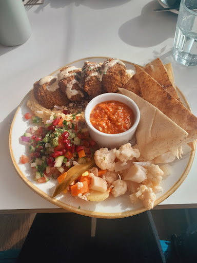 We came here as part of a large group which reserved the top half of upstairs. The food was a buffet style mix of Middle Eastern cuisine including, but not limited to, hummus, chips, assortment of roast vegetables, olives and finger sandwiches (all vegan dishes).