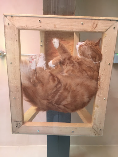 I can't help but feel if they laid it out like a standard cafe with tables and chairs it would be better for all concerned, including the cats and the staff. It would be clear who was sat where. You could then have a dedicated petting area to go and get a closer look at some cats. There would also be more room this way so you're not falling over other people and cats.