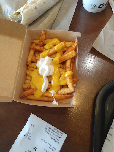 Alright: Food is ok, variety isn't what it used to be, meat choices lack a feeling if quality (both the beef and the chicken are a bit rubbish) fries and nachos are over-seasoned (just a little less would be fine guys, seriously) and the burritos are too long and thin (both ends are just dry tortilla with a goopy mess in the middle, taste is fairly pleasant though), if anything I feel like portions have got smaller inside the burritos, this might be the way they've been wrapped though. It's a little overpriced for what you actually get, though my kids love it, I prefer it to maccys or KFC. Attached is a photo of the fries we got for £2.49