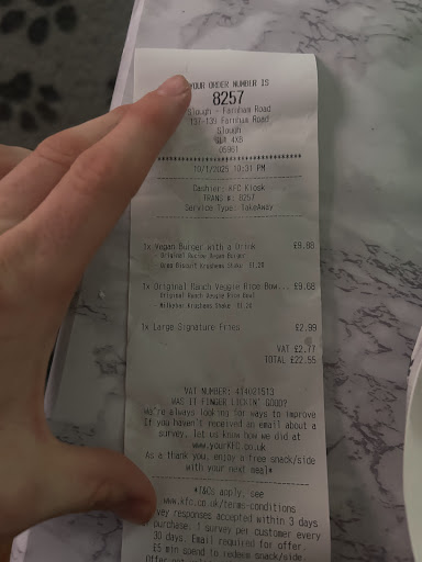 Situated off a Main Dual carriageway Farnham in Slough industrial estate, where the likes of Wicks, Selco, huge Aldi are also present, mainly used for it's drive through, however, there is seating available inside, it's clean and tidy. The touch screen doesn't have easy to find favourites like the mini fillet burger and removing lettuce from itemised items was not achievable at the screen, I was not alone in my failed attempts to customise and find what I wanted. Which meant ordering from the kiosk. At the kiosk, this is manned by lovely ladies, very polite and peaceful and so willing to help, however, being predominantly an Asian area, the staff are mainly Indian/Pakistani, beautiful and polite, there was a slight difficulty in the accent and language barrier, which was a little frustrating after not being able to customise on the touch scree, time wasted, I wasn't in a hurry though, just hungry after visiting Selco for filler, sand paper and scrappers etc! Plenty of room to park up. One chicken wrap came slightly after all other items, I personally went for a zinger stacker with cheese, no lettuce and sauce accompanied with three pieces of chicken and was able to communicate no drumsticks, just breast and thigh and that's what I got, I don't go for fries, as the skin is left on the chip and that gives me the heebie geebies, fingers down the chalk board affect due to being texturally neurological divergent. I was happy to eat the missus left over fillet too and all was left soft bones eaten too, finger liking great. I couldn't however divide general waste from recycling, having painstakingly sorted all the paper and card from bones, the one bin for everything scenario on the way out disappointed, probably only going to landfill anyway, do not quite me. I wasn't the only one with the accent and language barrier issue, as I could hear another Man getting a little frustrated, they appear to be used to it and all worked out well, as I say these wonderful ladies are peaceful, respectful and beautifully polite with patients to be admired. The man eventually had assistance at the touch screen by one of the serving women, the Man then went on to assist another man find the same item ordering next to him with his new...