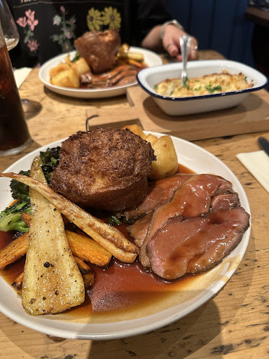 Read moreSunday lunch. Slightly unusual pub configuration. There's a traditional area as you walk in with bar centrallyvsnd tables to both sides. There's also an area to the rear, up some steps which has none of the traditional pub feel. There's a separate bar area here and access to the garden. The waiting staff are young, attentive and helpful. We had roast chicken and roast sirloin. Well cooked and tasty with excellent vegetables. We also had dessert and I can recommend the bread and butter pudding with white chocolate. The atmosphere was typical of a Sunday but I think they could do with the fire being lit as it was a little draughty. With a glass of merlot and pint of Camden, the whole bill was £76. There's quite a bit of parking area across the road, too. Dogs and...