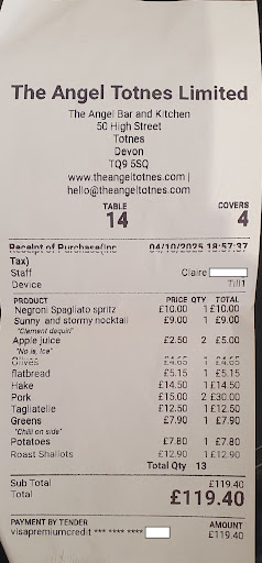 Ā Ā Ā Read moreAfter finishing work later than planned, me and my mate walked down Fore Street in Totnes looking for somewhere to eat. We walked in a few places only to be told that the kitchens were closed!! We had left it late and were just about to give up when we came across The Angel!! Even though the kitchen had just closed the staff (who were lovely) decided they could help us out. The chef popped out with a menu and went through a few dishes that heād be able rustle up quickly so we could eat. We decided on some Hummus, flat bread, steak and crispy fried potatoes with aioli. WOW!!! The food was fantastic, the hummus was the best Iāve ever tasted, served with roasted carrots and garlic on top it was delicious, so was the flat bread topped with roasted nuts, steak and potatoes. The staff seemed genuinely pleased that we happy with our experience, a true sign of a great place. Thank you I...