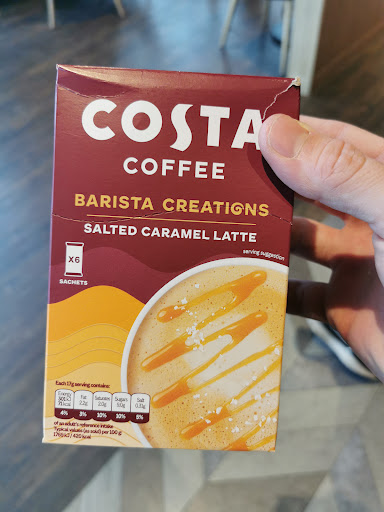 Dropped in for our Christmas favourites after the Christmas Gift & Food Show at the county showground... NEXT Costas are often a tad smarter & more comfortable than their high street counterparts. Wife's velvet cappuccino was very nice she said and my hot spiced apple didn't disappoint, bar the omission of a cinnamon stick. Only 2 staff on it appeared, friendly & working to get all the orders sorted. Sadly the place was very untidy with cluttered uncleared tables everywhere, previous customer's messes, etc. They were doing their best....perhaps a self service/table clearing rack might help on days where they're...