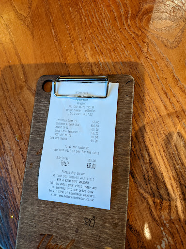 We come once every few months to see if things have improved and it's always the same old story. We left it again about 3 months and got the 30% voucher off through the door so we thought we'd try again as it's fairly local to us. We eat out a lot as a couple and a family, we are no expert food crititcs or chefs but we have been eating out together very often for about 14 years now. We understand costs have gone up for your industry but so have people costs of lving and wages like ours have not gone up with inflation. so when we go out we want the best for our money like everyone else. Anyway our main problem always with the brown hare is the cost to quality ratio. You have prices of a really good Gastro pub Like The Continental in Preston and The Royal Oak at Riley Green but the food here is levels below those places. Just one of many many examples of poor food experiences (Won't list them all of course) We once ordered BBQ chicken wings and it litterally came as 3 plain wings that looked like they had just been microwaved, no coating, no seasoning just slimey skinned plain with a tiny pot of bbq sauce on the side but paid something like £7 for these. Just no. I think somebody from Marstons needs to visit pubs like mentioned above and see the difference for around the same price. The place in all these years is never busy when we go in and surely by now you must no it's for a reason. The food just isn't great but your charging as if they are. The amount of times we have been and ordered food and there is always something missing on the plate that was on the menu. Or you order fisha nd chips and you get a tiny tiny pot of very dry hard bland mushy peas on the side that's proabbly less than a tablespoon. Again, just no. We have given the place so may chances now and feel our money is wasted now everytime we go. With the 30% voucher our bill still came to £70 for us 2 and our little boy and again medicore food, Went to the continental a few days later, same set of meals and rough drinks.... no voucher... Our bill was £70! And.... The food was fantastic and all freshly made and prepared etc. Fresh daily specials etc etc. You guys seriously need to compare to other places in the area to your price-quality ratio. Well dated decor inside too.again... other places much nicer and the same prices as yours. We've said we won't come now until we've heard way into future by word of mouth etc. that it's been turned around. Just not...