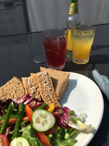 A lovely cafe with plenty seating inside and out under a marquee..amazing tasty food with good choice.. we settled for a bacon and egg butty delicious but we were spoilt for choice but only wanted a sandwich and we were pleasantly surprize when we got the bill £13 plus pence for two bacon egg butties and two tall glasses of fruit juice..menu has plenty of choice..happy pleasant bright atmosphere friendly helpful staff and if you need a dog fix dogs are allowed in the marquee and while you are there visit the fab garden centre and other craft/gift shops also the fruit and veg shop thats sells all manner of old fashioned sweets but be wary of school coming out times as it gets packed with school kids buying all buying several items of old fashioned sweets just like we used too lol.. all in all a lovely uplifting day out...