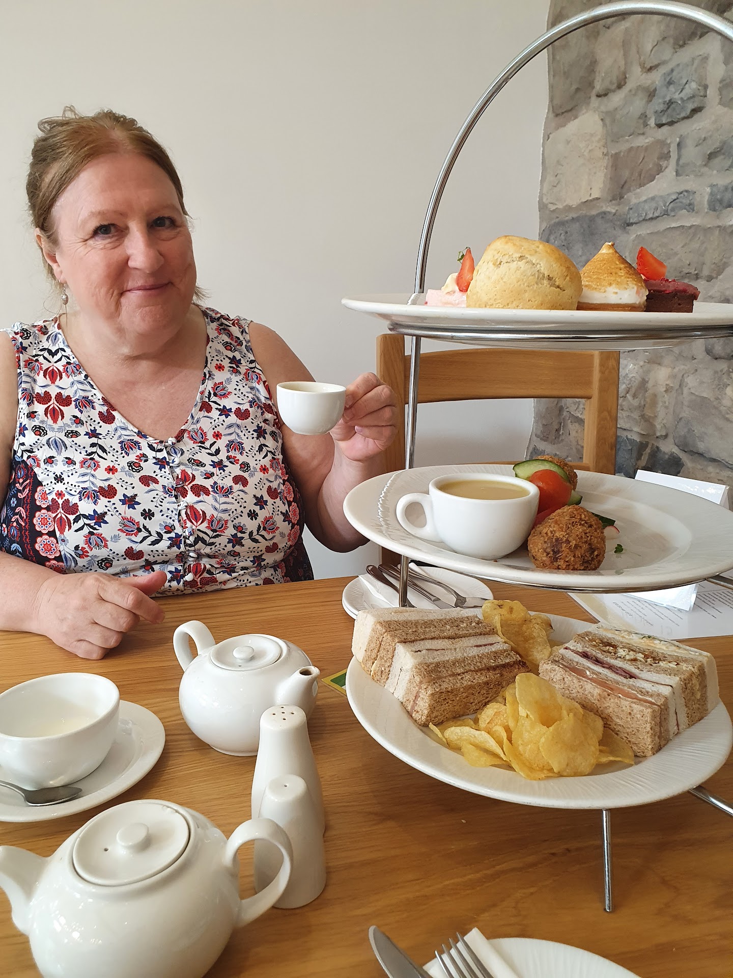 Spent a lovely few hours at this cafe, it was nice and cool inside which was nice after being in the hot sun! Staff were very welcoming, smiley and thoughtful asking if we had any dietary requirements. We had the afternoon tea at ÂŁ15 per person (that i prebooked last week) with a selection of finger sandwiches, favourites were the egg & cress and the salmon & cream cheese. Dessert was a homemade scone with clotted cream & raspberry vanilla jam (which you can buy in the shop next door) and was absolutely delightful. We also had a mini lemon meringue pie, strawberry mousse and a tiny chocolate mousse. Very delicious! You can buy cakes and bakes to take home and knowing that we were supporting St Catherines Hospice was really worthwhile.