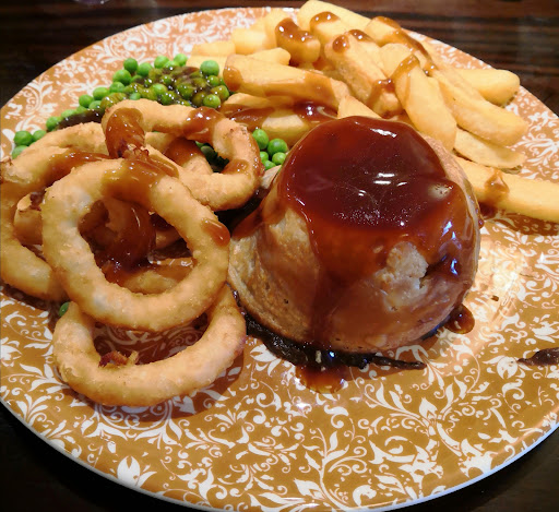 Part of the Greene King chain of pubs. Ample parking, the tables well spaced, staff very helpful and attentive. Standard pub type food. My Steak and Kidney pie was a little dry inside. A pot of gravy was supplied with meal. My friend's Chicken and Mushroom pie was moist inside but the pastry was a bit hard. Prices not too bad for what you get. See pictures, onion rings were a extra.