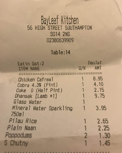 The service at Bayleaf Kitchen was impeccable. The staff were knowledgeable and passionate about the menu, offering excellent recommendations and ensuring that every detail of our dining experience was perfect. Our server was attentive without being intrusive, and our meals arrived promptly, hot and beautifully presented.