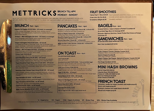 Read moreI've always loved the eccentricity of Mettricks. The coffee shop / Cocktail bar type / Café - mannerisms in the personality. Their cocktails are lovely but not knock your socks off type lovely. The Salted Caramel Martini is pretty lush and if you're not into something that sweet then they make a pretty good Bloody Mary as well, though. Perhaps they could spice it up a bit with some identity, and add their own twists on things. The food is a notch up from the cocktails and it's definitely somewhere where you can go for a bit of different. Fully loaded hash browns with Parmesan and truffle is particularly mouth watering and not as pricy as a lot of the options on the menu. Average price for a good lunch would set you back about £9 and there are a few more expensive options; the quality of the food reflects that, though. So not horrendous. Their coffee is something they pride themselves on and they make that abundantly apparent. I can see why, it is very good and was pleased to see a selection of replacement options for cow's milk. I'm not a vegetarian and far from vegan but I really enjoy their vegan options. It's very tasty and they put some good combinations together. The vegan breakfast wrap is a particular favourite. Not that I can really remember but I'm sure vegan food was not this good 10 years ago. Next time you can use that to offset some of your carbon footprint. Overall a really great little place and I've visited Woolston and Guildhall a few times. Their ethics, mission and vision is admirable and their values reflect in...